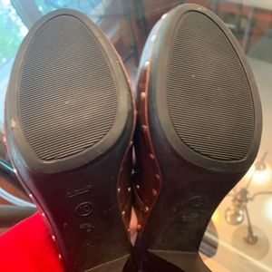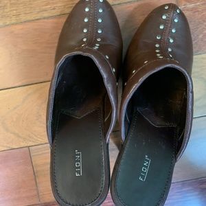Fioni retro hippie high heeled studded clogs on chocolate brown studs are silver size 10