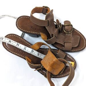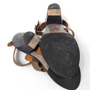 Adjustable gladiator style ankle wrap with open 3" stacked heel. Brass hardware. Little to no wear to the sole, no flaws to the leather upper.