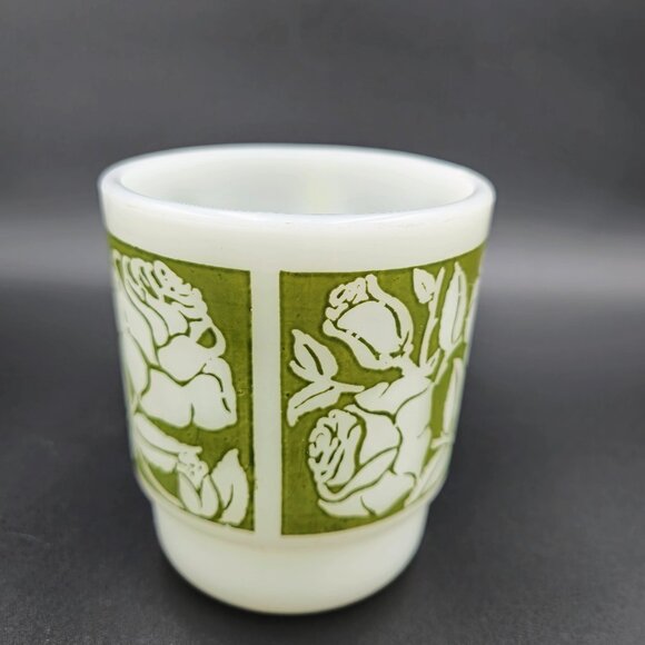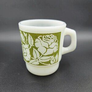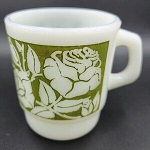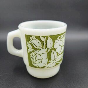 Fire King Anchor Hocking Green Rose Mug Cup Milk Glass MCM Vintage Read