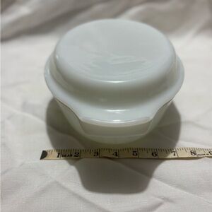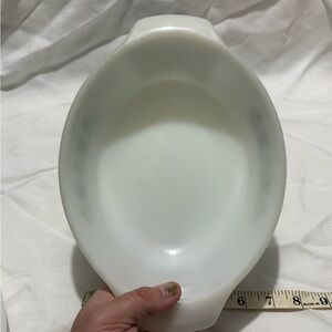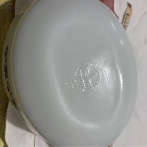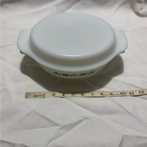 Charming casserole dish with a green floral design. Ideal for baking and serving. Small chip on the inner lip only the lid.