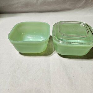 The Fire King Oven Ware Jadeite Refrigerator Dish is a 4.25" x 2.75" ceramic dish from the Fire-King product line. These two decorative cookware pieces are perfect for serving or storing food in the refrigerator. The jadeite color and durable construction make it a stylish and practical addition to any kitchen or dining table. These vintage items have been well taken care and would be a asset to any kitchen. A stunning MCM collectible.