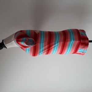 Coral, red and blue striped tshirt. White graphic print is on the back. It has flowers and a skull. Material is krinkled. Made that way. Cap sleeves. Vneck front and back. Fitted. Pit to pit is approximately 16.5" and length is 25 ". Gently worn.