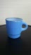 Vintage FIRE-KING Stacking MUG in Periwinkle blue with a donut handle. Made in the 1960s by the Anchor Hocking company. Made in USA. Features opaque exterior colour, white interior, donut-shaped handle, unusual black rim.
