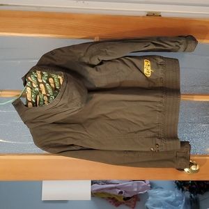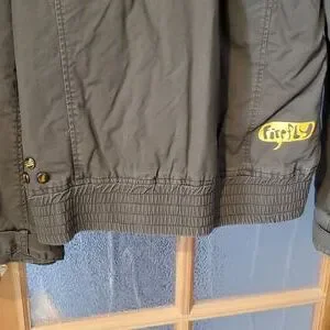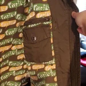 Khaki Brown Firefly fall/winter jacket with removable hood. Has zipper and clasps, 2 outside pockets and 2 inside pockets. Very good condition, size XL but fits more like a ladies 8-10 in my opinion. I believe it is a teens xl but can't remember for sure. Will for sure fit a size M( and maybe size L) woman