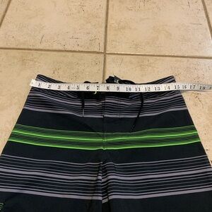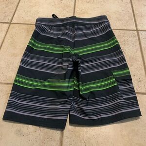 Get ready for the beach or pool with these vibrant Firefly board shorts! Featuring a stylish black and grey stripe pattern accented with bold neon green stripes. The shorts have a lace-up front and a side cargo pocket for convenience.