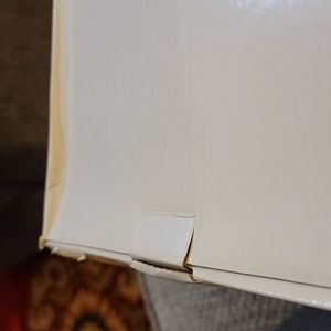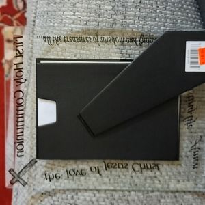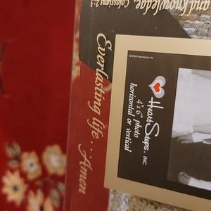 This glass frame has wording around outside. Holds a 4 by 6 inch, outside dimensions 7 inches across and 9 inches high. Has original box, box flattened from storage but frame inside mint.