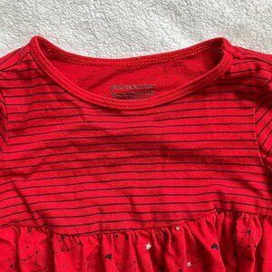 First Impressions baby infant dress or tunic shirt, size 12 months. Red base with navy stripes on the sleeves and upper body, a gathered skirt with a star and constellation print, and long sleeves. Made of 100% cotton.