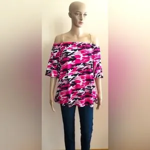 Pink Camo Top with Shoulder Chain Straps. Elastic Neck. Bell Sleeve