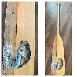 Hand painted fish scene on a wooden paddle. Intended for decor use, not intended for actual use in water.