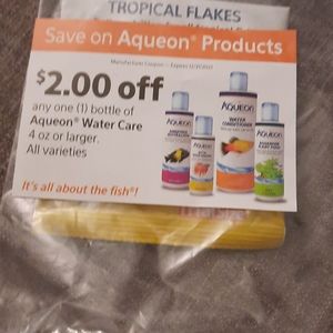 I have a package of not used Tropical Fish Flakes, a $2.00 coupon for Goldfish Flakes and Tropical Fish Flakes, another $2.00 coupon for Ammonia Neutralizer,Betta Water Renewal,Water Conditioner,and Aquarium Plant Food I am selling them for $6.00 OBO