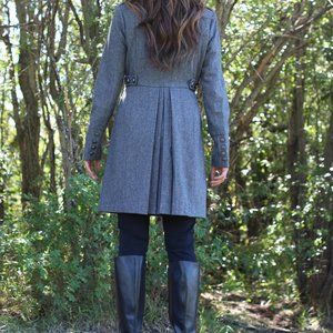 This double-breasted coat is an above-knee length outerwear crafted in a wool blend with a timeless fishbone pattern fabric. The coat is designed with two side pockets and a stand-up collar. The coat features pleats in the back and stunning black nickel buttons on the coat front closure, cuffs, pocket flaps and shoulder epaulets. It is an excellent option for business, formal and casual occasions.