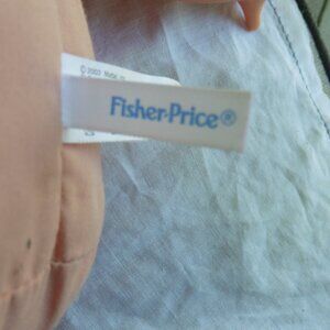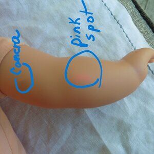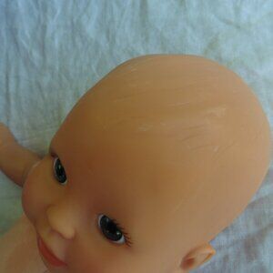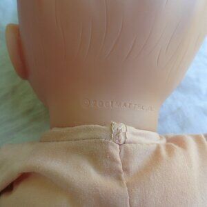 Fisher Price. Cloth soft body, vinyl arms, head, legs. Has two teeth & 2 front teeth. Refer to pictures - top of head has faint whiteish spots and arm has a pink spot. Both not very noticeable.