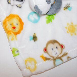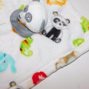 This hard to Find Fisher Price Plush Panda Bear Security Blanket with Multicolour Animals Baby lovey nunu Soother is in Excellent clean bright soft condition. Security Blanket is 100% Polyester - Machine washable. Blanket measures 12" x 12"