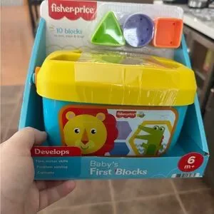 Brightly colored blocks for shape sorting fun. Encourages motor skills and curiosity. Includes a yellow lid and blue container.