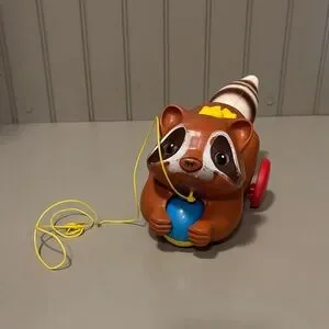 Classic Fisher-Price pull-along raccoon holding a blue ball. See all pics for overall condition due to its age .
