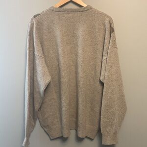 This is a beautiful v neck lambswool sweater in a tan colour with an argyle print on the front. This has a bit of a drop shoulder