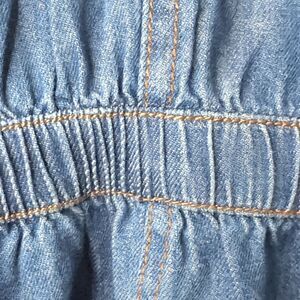 Old Navy V-neck. Seamed back yoke. Short sleeves, with shirred shoulders. Nine-button placket. Contoured workwear-style seams and banded waist