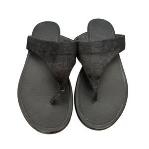 In excellent condition.These FitFlop black leather thong sandals are perfect for women who want both comfort and style. With a US shoe size of 11, these sandals are made to fit perfectly and provide maximum comfort for all-day wear. The sandals feature a wedge heel style and a flip flop design, making them perfect for casual occasions. The upper material is made of leather, which adds a touch of elegance to the sandals. The character of the sandals is a flop, which adds to the overall style. These sandals are a great addition to any wardrobe and are sure to become a go-to choice for any summer occasion. Approximately 1" wedge at the heel