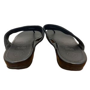 In excellent condition.These FitFlop black leather thong sandals are perfect for women who want both comfort and style. With a US shoe size of 11, these sandals are made to fit perfectly and provide maximum comfort for all-day wear. The sandals feature a wedge heel style and a flip flop design, making them perfect for casual occasions. The upper material is made of leather, which adds a touch of elegance to the sandals. The character of the sandals is a flop, which adds to the overall style. These sandals are a great addition to any wardrobe and are sure to become a go-to choice for any summer occasion. Approximately 1" wedge at the heel
