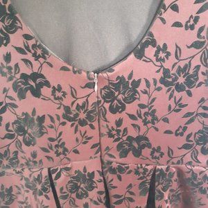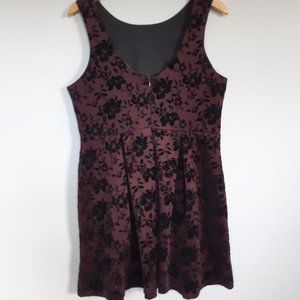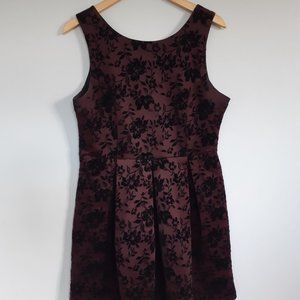 Dex dress, sleeveless, rich burgundy maroon with black velvet floral detail, jacquard, pleated skirt.