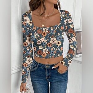 This elegant blouse features a charming floral design with a fitted silhouette that enhances your style. The long sleeves and soft fabric ensure comfort, making it perfect for any casual outing. Stretchy fabric and round low neckline. Brand new, never worn.