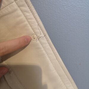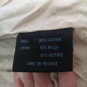 Super cute, real leather. One small pen mark on the inside. I've never tried to remove it as I didn't want to risk damaging the jacket, but I'm sure someone with enough patience could fade it out or remove it completely. Not visible at all when wearing. This is the only flaw on this jacket.