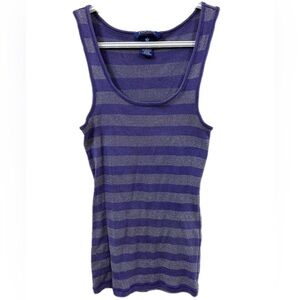 This fitted tank top features alternating stripes in shades of purple and gray, offering a stylish and modern look. The sleeveless design and scoop neckline make it perfect for warm weather, while the stretchy material ensures a comfortable fit.
