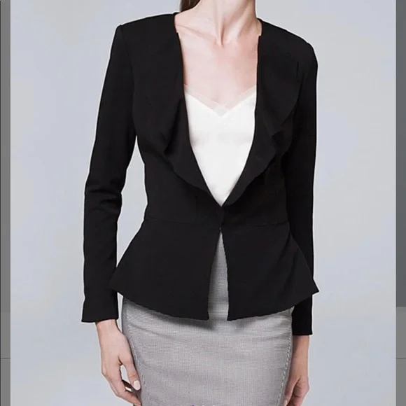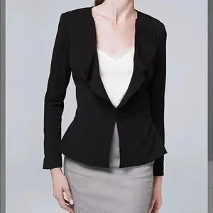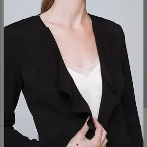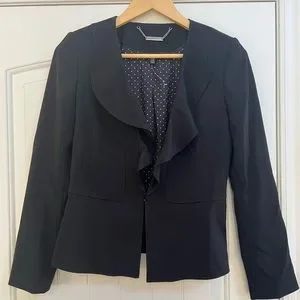 Beautiful fitted black jacket, fully lined with very thin shoulder padding for shape definition. Hook closure at the front.
