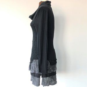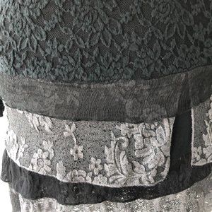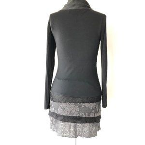 Fitted Tunic has lace body, scoop neckline with small cowl, grey and silver lace tiered skirt with side slit, long sleeves and stretch.