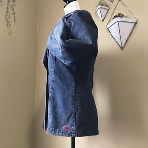 Gorgeous denim blazer/jacket with one button closure and red stitching along the seems to add a pop of colour. Has a fabulous fitted silhouette. Excellent used condition, no flaws.