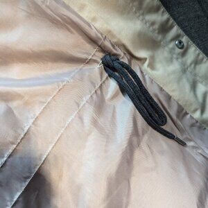 Five Four men's chore coat in excellent used condition. This versatile piece features a classic utility design with four front patch pockets, collared neckline, and hidden placket closure. The tan cotton-blend shell is fully lined for comfort, with an interior drawstring waist for customizable fit.