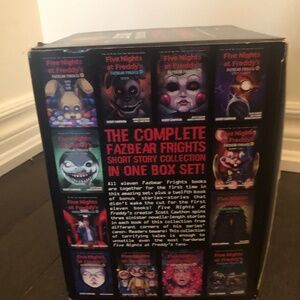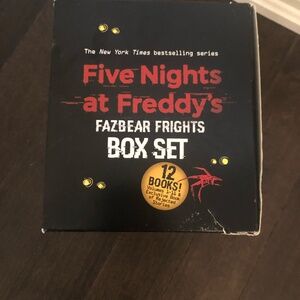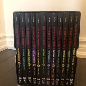 Five Nights at Freddy's book set purchased at Indigo. 12 books in total, Only read the first one in series and part of second, rest not even touched. first one barely worn, spine unbroken, rest are slightly worn at the top from sitting in the box.