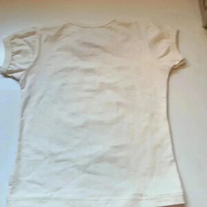 I’m afraid there aren’t any tags on this little T-shirt, but it feels like it has some cotton and spandex. It has lots of stretch. Lightly elasticized at the sleeves. Certainly a nice piece for a special occasion!