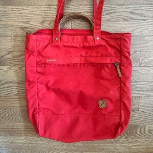 Red, waxed canvas tote with brown leather details. Can be converted to a backpack. In excellent condition, one scuff mark on the back (see photo).