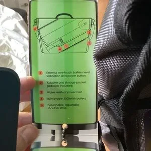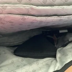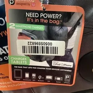 Charges up to four devices. Battery back still zip tied. Messenger style.