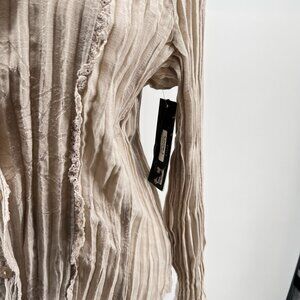 This handmade Flair button-down shirt in size Large is a standout piece with artisanal charm. Crafted from a soft cotton blend, it features a special wrinkle effect for added texture and style. Delicate cotton-crochet lace accents the collar, button placket, and cuffs, giving it a romantic, vintage-inspired feel. With long sleeves and a flattering silhouette, it’s perfect for both casual days and dressier occasions. The neutral tone makes it easy to pair with jeans, skirts, or layered under a blazer. In excellent condition and ready to elevate your wardrobe.