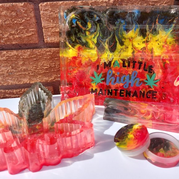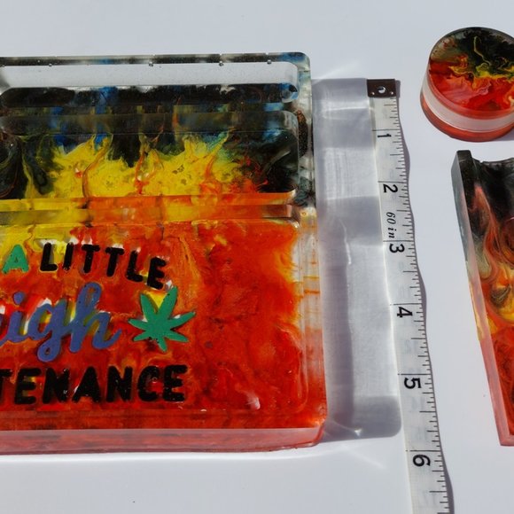 Custom Handmade Resin "I'm a Little High Maintenance" Flame/Cannabis Rolling Tray/Ashtray Set