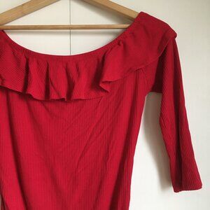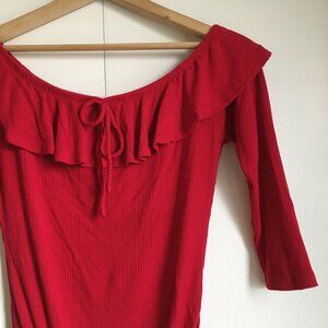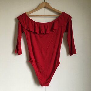 Very good preowned condition, solid flamenco red, ribbed, bamboo, snap closure body suit with a ruffled collar and 3/4 sleeves by Ardene. I'm not typically one for Ardene, but this is a pretty nicely constructed bodysuit. It's made of bamboo for comfort and breathability and the ruffles are just too cute.