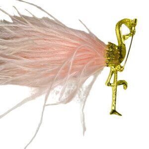 This vintage-inspired brooch just makes me happy! It is a flamingo in gold-tone metal studded with rhinestones and crowned with pink feathers.