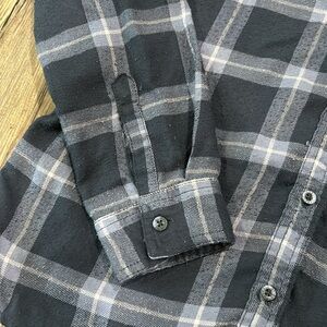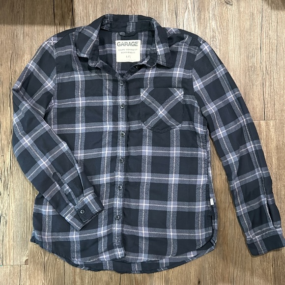 One of my favourite flannels! Used to wear this casually, but it hasn’t fit for a few years. Garage ‘Coupe “Boyfriend” Fit’ long sleeve blue/purple flannel.