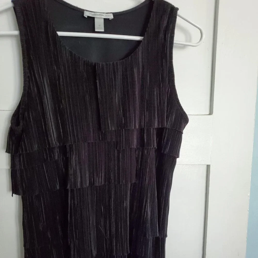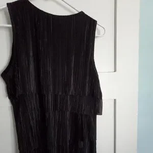 This top has layers on both the front and back that will shimmer and sway as you move on the dance floor! It is sleeveless, fully lined, loose=fitting, and very comfortable to wear.
