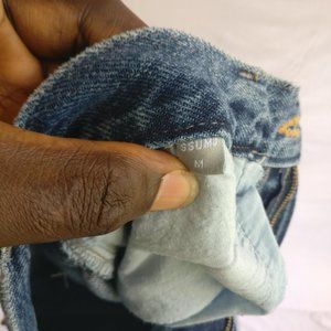 Material: tag came off sorry)100% Cotton Medium wash in Flare Leg. raw hem. Classic 5 pocket style+Belt Loops. ZIP fly. You'll love wearing this all the time. Comfortable, high quality. Guaranteed to stay in shape and NOT wear out. Highrise, Sits perfectly in all the right places sturdy jeans with NO stretch. excellent NEAT, gently used, never in dryer.