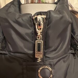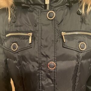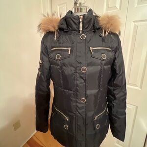 Gorgeous Black Flash Geo Duck Down winter coat in EUC. Real fur trim around hood. Stunning silvertone hardware. Fully detachable zippered hood with bungee cord to tighten around face (if needed).