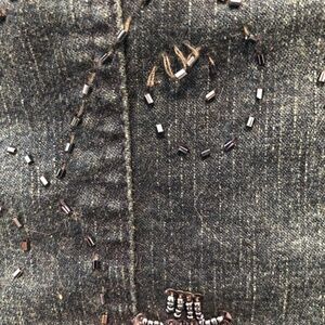 The beading and sequin on this jacket make it special. The colour is a very dark blue denim with a bit of distress look on the front and back. The size is a Small and the style is slightly fitted. The front slash pockets are useful without adding any bulk. It is 97% cotton and 3% spandex which make wearing a comfortable experience. It can be dressed up or dressed down. Very versatile and will make any outfit look great. I do want to point out that in a few places the beading is in need of a bit of repair. I have included a picture to show that.