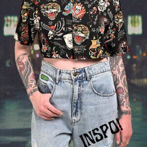 The Flashboard button up shirt from Ed Hardy comes boasting multicolored graphics of traditional tattoo flash throughout including a tiger, a flaming skull, and an eagle carrying the American flag. This 100% rayon top offers full button up closure with a classic turndown collar for a classy look.