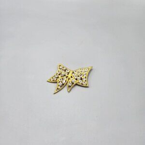 A flat bow-shaped brooch made of gold toned metal and clear stones of unknown type. In excellent condition, please review photos closely for dimensions.