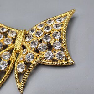 Flat Bow Brooch Pin Costume Jewelry Gold Tone Clear Stones Holiday Gift Xmas
