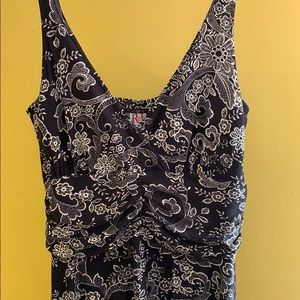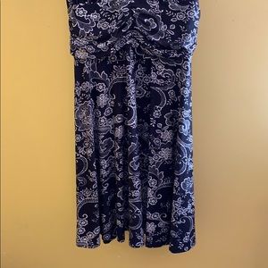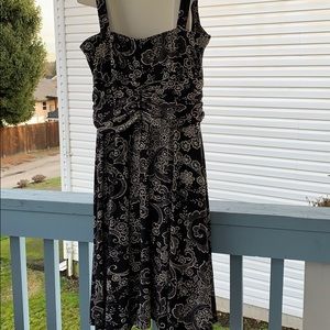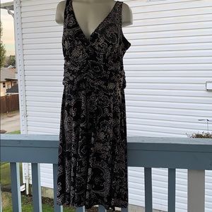 Dress is lovely not too long below the knee 93%polyester 7%spandex great as doesn’t wrinkle , put on and go