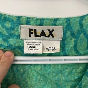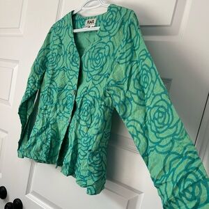 Flax linen blouse with teal floral design. Features white buttons and long sleeves. Peplum style hem.