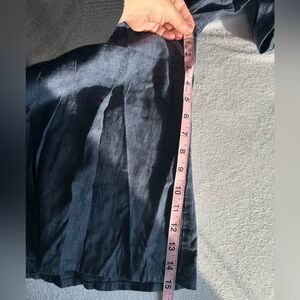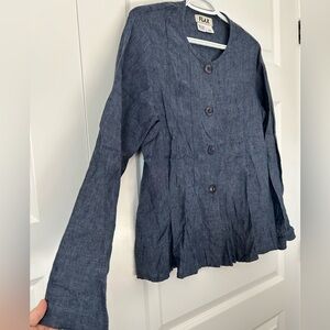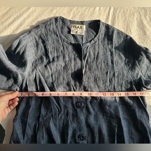 Elegant navy button-up top by Flax. Simple and versatile design. Chambray/denim look. 100% linen.